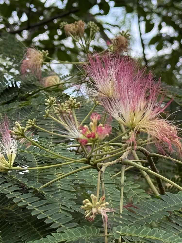 ネムノキーありそうで割と身近で見かけない花で、よく似た葉っぱはよく見かけるけれど、違うものらしく花は中々見かけません。