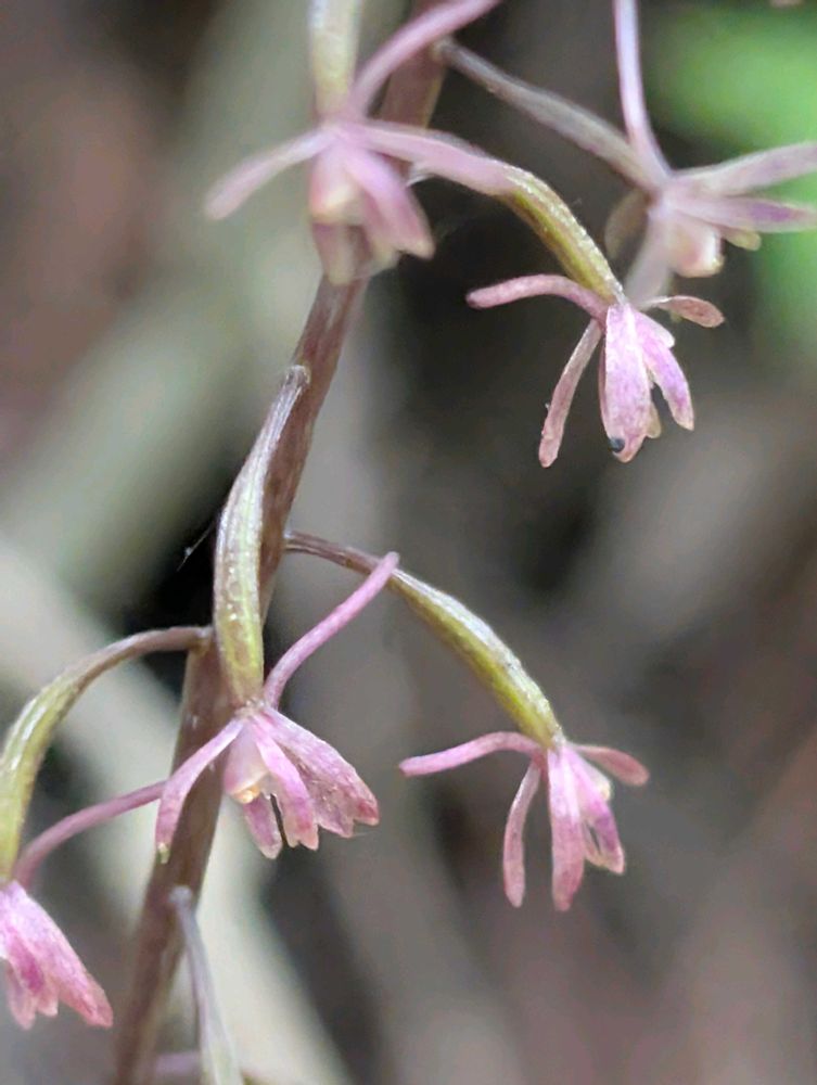 花は総状花序に5〜10個、下向きにまばらにつける。紫褐色を帯びた淡黄緑色で、直径5〜7㎜。