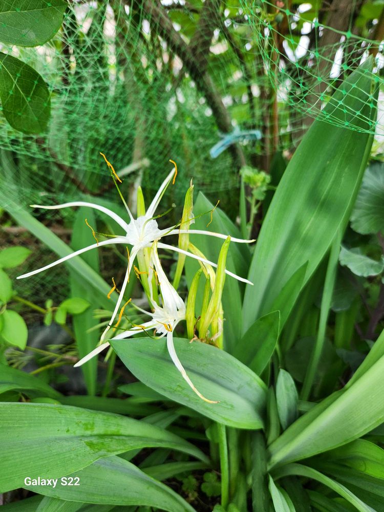 畑のブルーベリーの木の下に移植したヒメノカリスと思われるのに、白いお花を咲きだしました。お迎えした時から名前無し、ここに移植してから お花が咲きだし、この場所がお気に入りのようです。