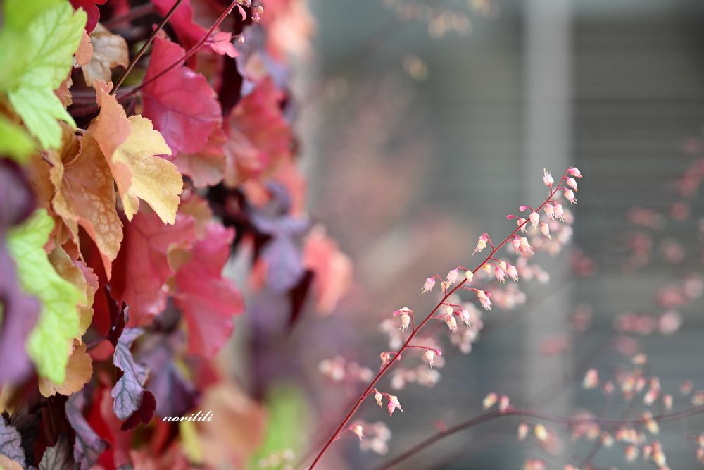 きれいに色づいたヒューケラの葉っぱと花です。