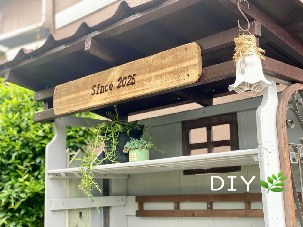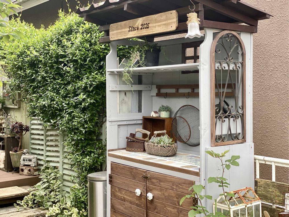 元の棚の横板を横壁に使い、屋根を付けて後ろに板を張り😊あとは家にあっても行き場が定まらなかった雑貨の窓などを取り付け定住させました🤣 みんないい感じのサイズで使えるー٩(^‿^)۶