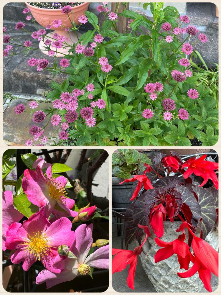 ①玄関前はアストランティアがずっと咲いていますし、球根ベコニア達も咲き出しました✨