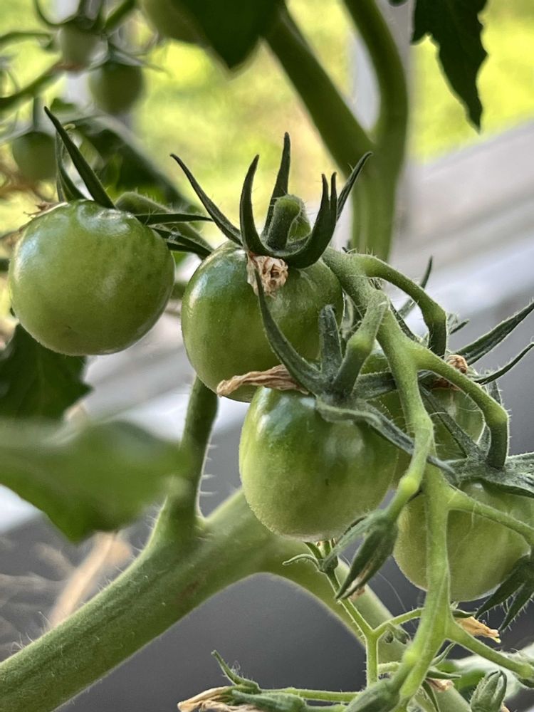 ベランダの夏野菜たち。あばしゴーヤーの雌花は6つ。うち1つは結実したようです。