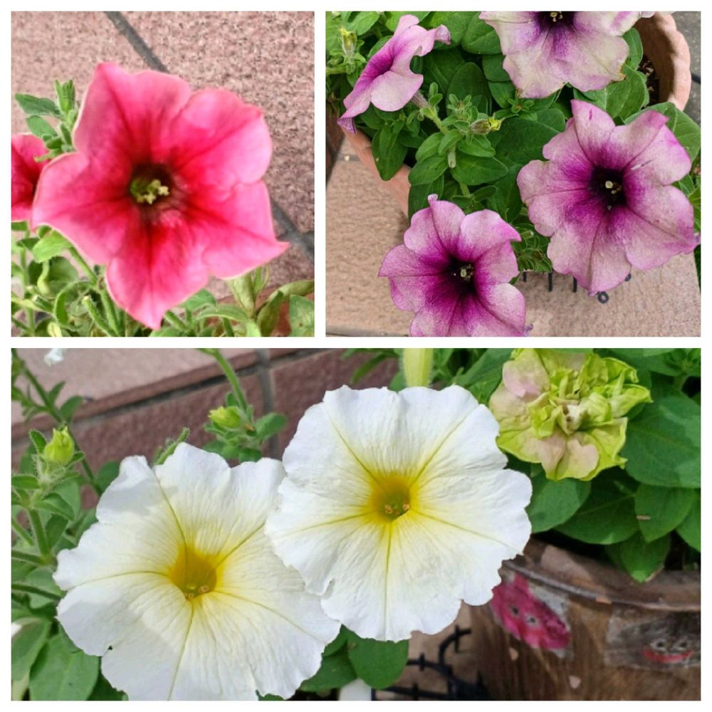 我が家のペチュニアたち。見切り品と頂き物ばかりですが、それぞれ色が個性的で気に入ってます。
