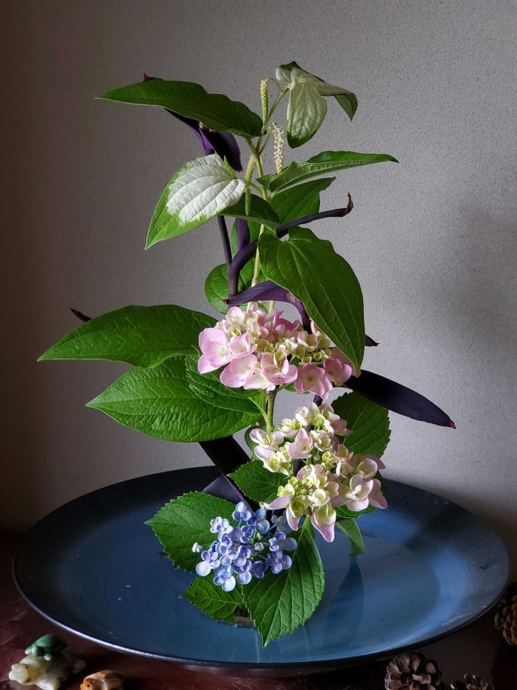 前回水盤に入れた紫陽花が萎れてきたので入れ替え。生ける為に育てているのもあるけど、庭の花を見ながら組み合わせを考えるのは楽しい