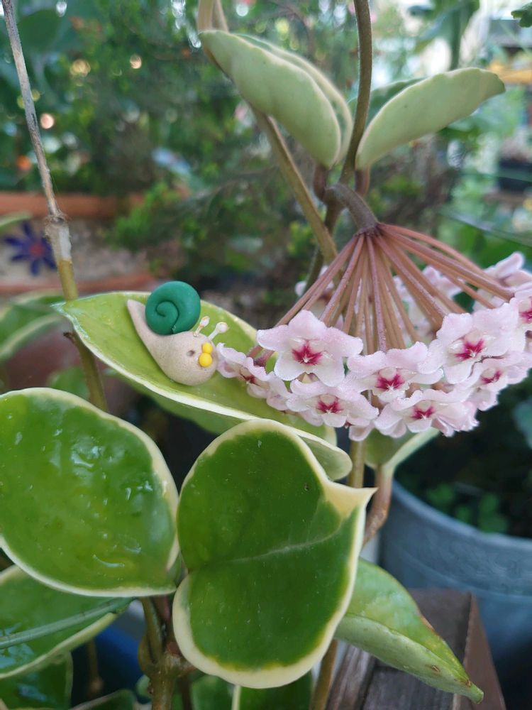 (*ˊᵕˋ*)੭ ੈこんばんは~暑い1日でした〜🔥🥵💦 ホヤって本当に飴細工みたいで綺麗だね~マイマイタン🐌と👍 スプリットペタルもう咲いたのね~😳💞家はこれからよ🤭💦ローズゼラニウム🌸も咲いて良かった〜葉モミモミしてね😁👌