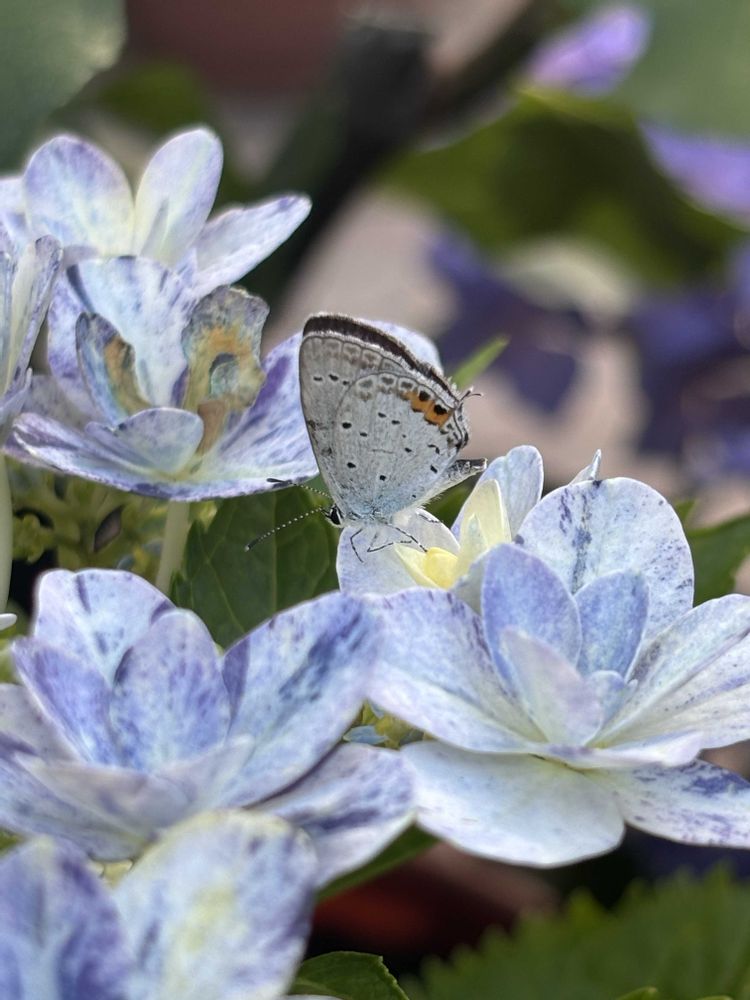 夕方、庭パトをしていたら紫陽花「衣純千織」にかわいいお客さまが