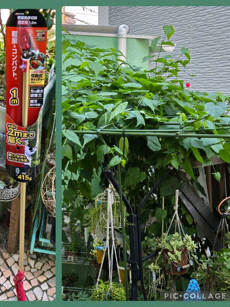 アブチロン・チロリアンランプ春に剪定したら去年より延びて?🙄隣の家の方にピョンピョンしてきたので高枝挟み買ってきました😊園芸店・AmazonよりHCが一番安かった~