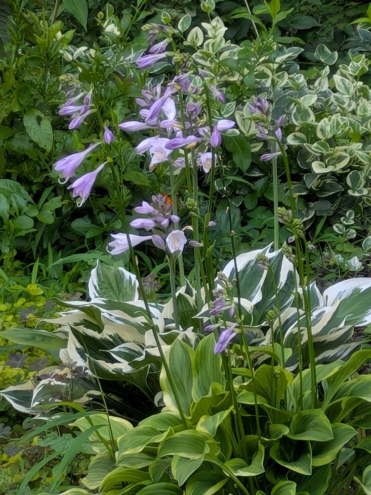 2種類のギボウシお花が白と紫色で素敵斑入りの葉っぱも涼しいげで素敵なpicですね💞