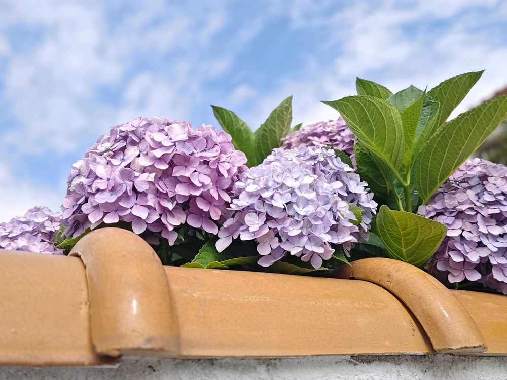 ご近所散歩の紫陽花。毎年、オレンジ色の塀瓦(笠木瓦)から、大きな花をのぞかせて綺麗です。