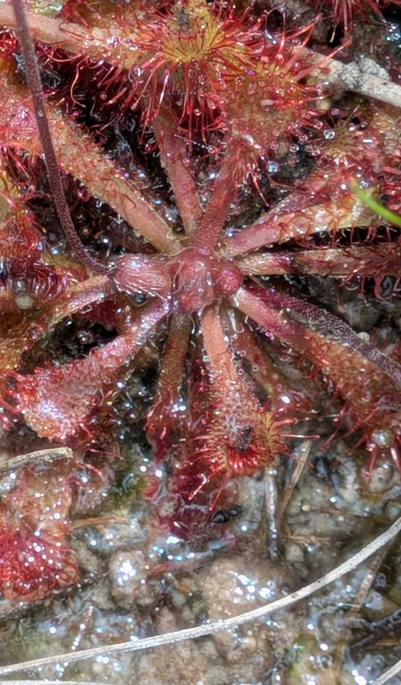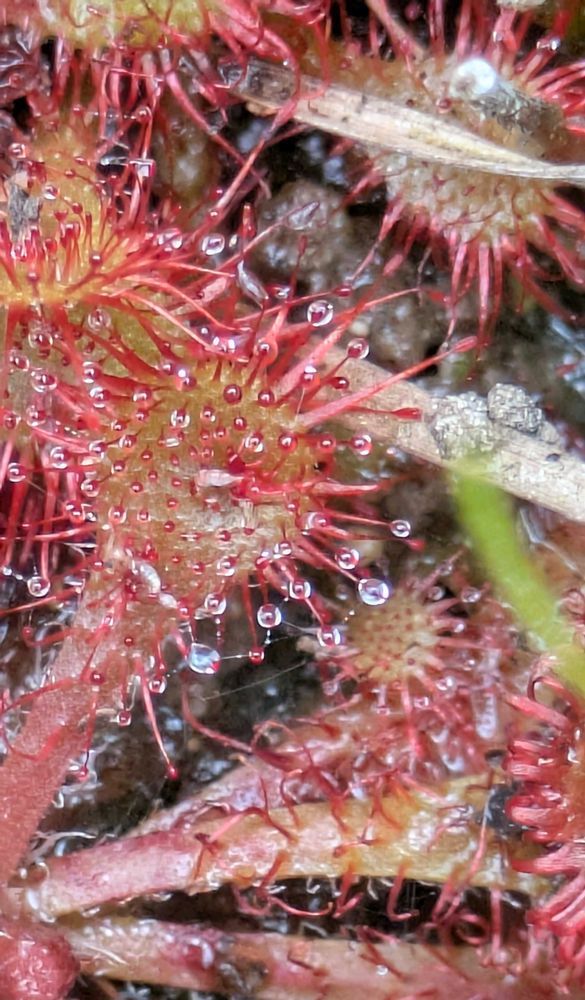 赤い葉には線毛が密生していて、粘液を出して虫を捕らえる食虫植物だ🔴