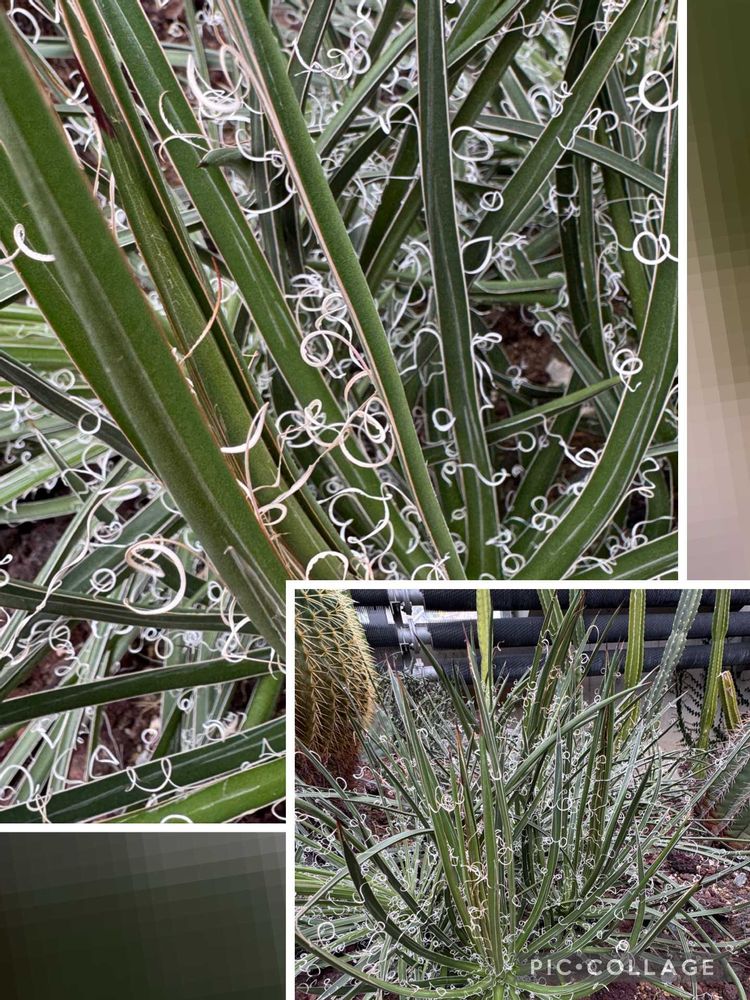 葉の縁に白い糸状(トゲ)のものが等間隔でカールして生えています
