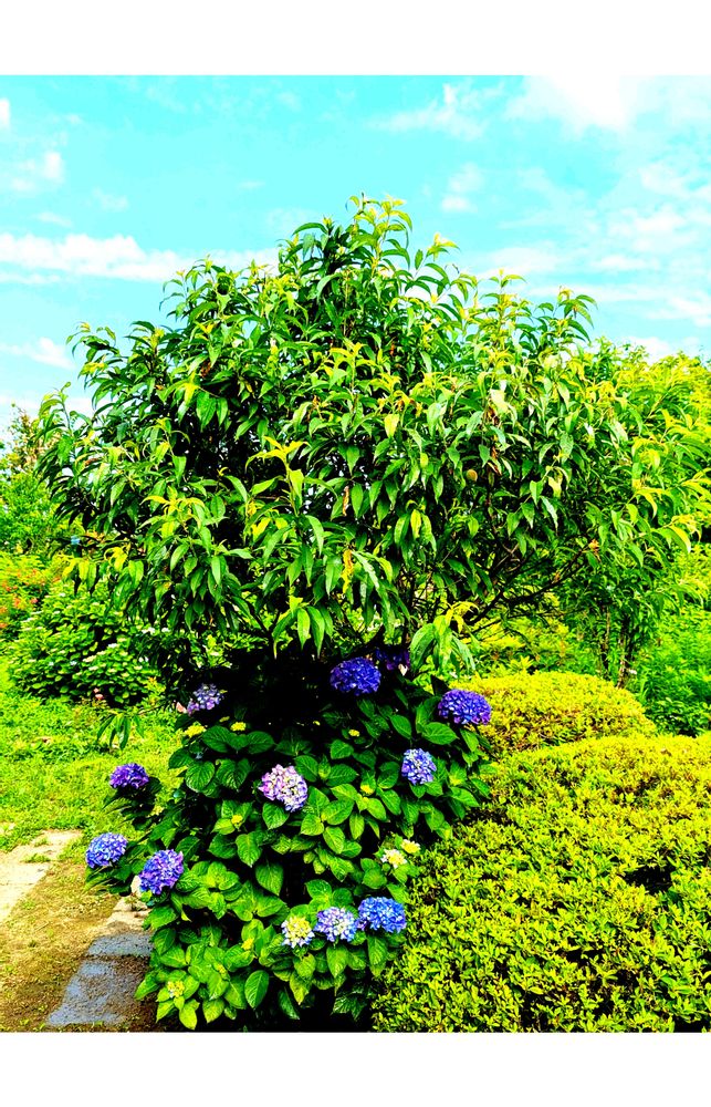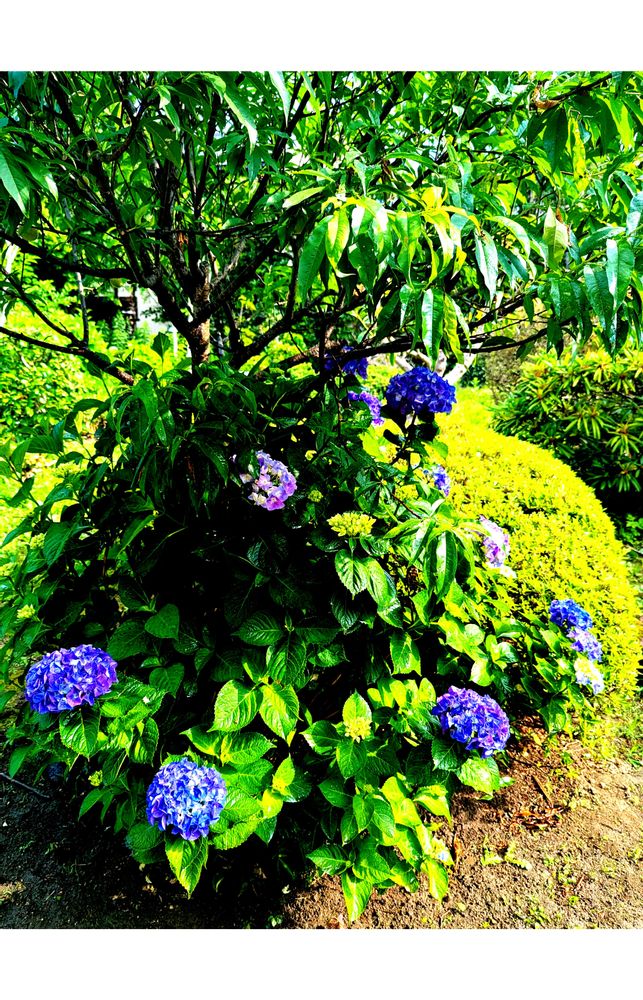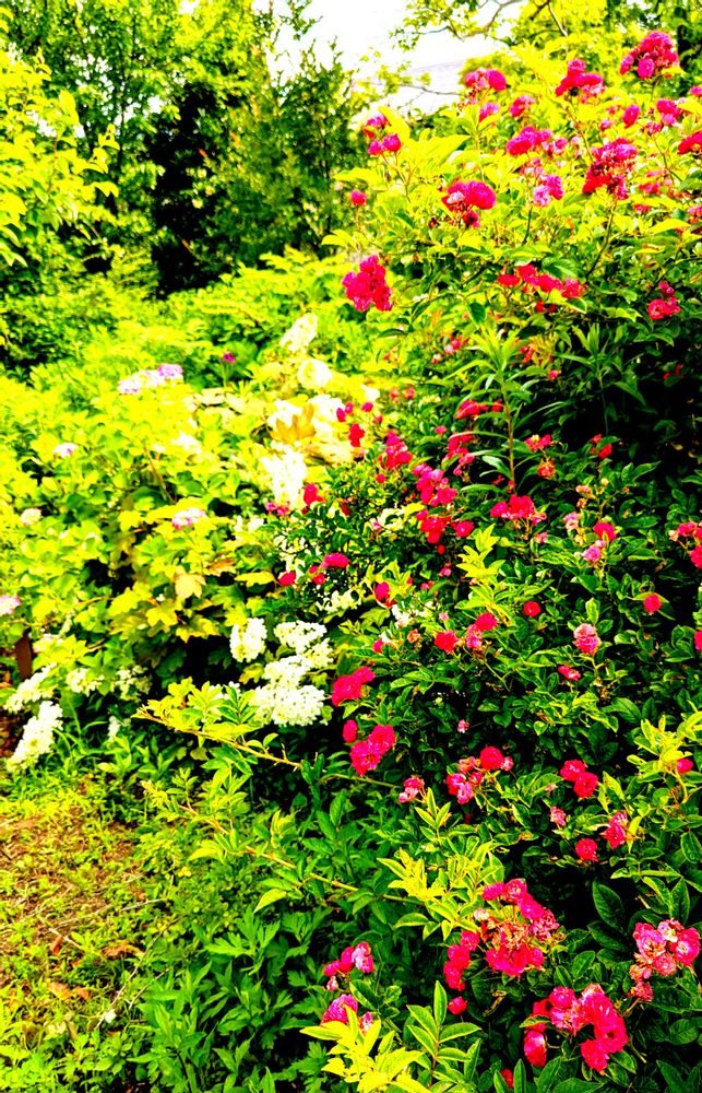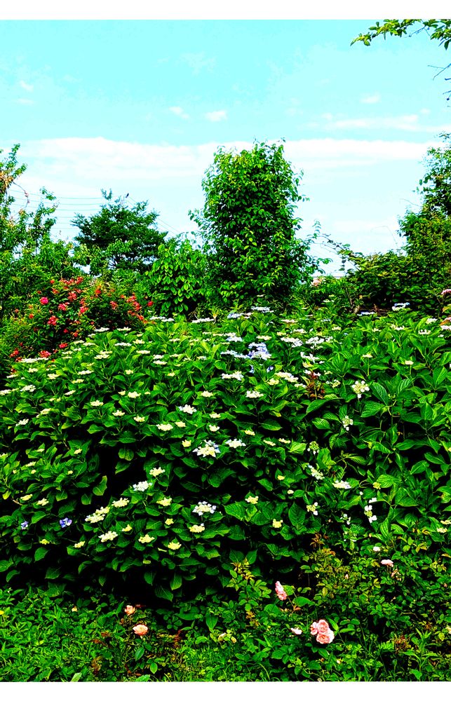 2️⃣ 左奥の方にアジサイの塊💠とバラ🌹の塊が見える