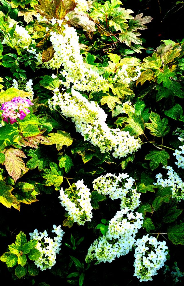 バラの塊🌹の右と後ろにカシワバアジサイ🤍