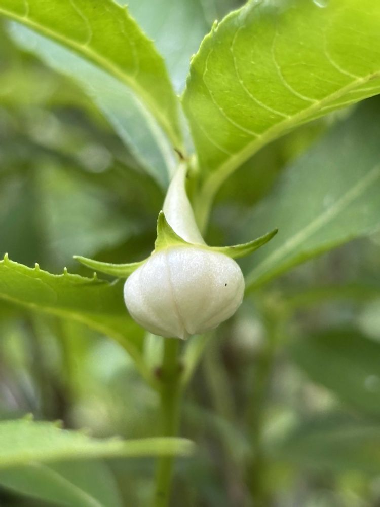 白い蕾が4つに割れるように開くと中に2本の雌蕊とたくさんの黄色い雄蕊。