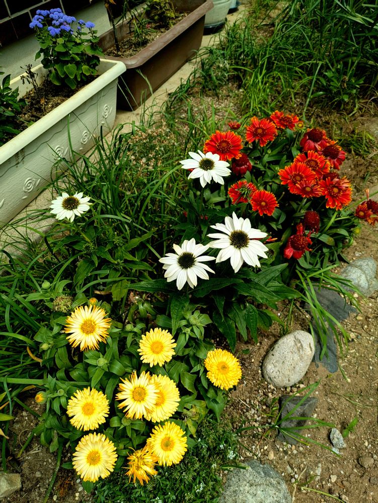 草むらニラ🤔の中にガイラルディアやエキナセア、キンセンカ咲いています✨💕。