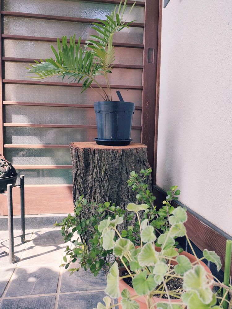 2枚め/近所の「薪差しあげます」コーナーに取り残されていた丸太をせっせと運び、花台にしました。今までヒビの入った古い甕(かめ)を逆さにして代用していたのですが、これでようやくお役御免。甕よりはるかに見栄えよし👍