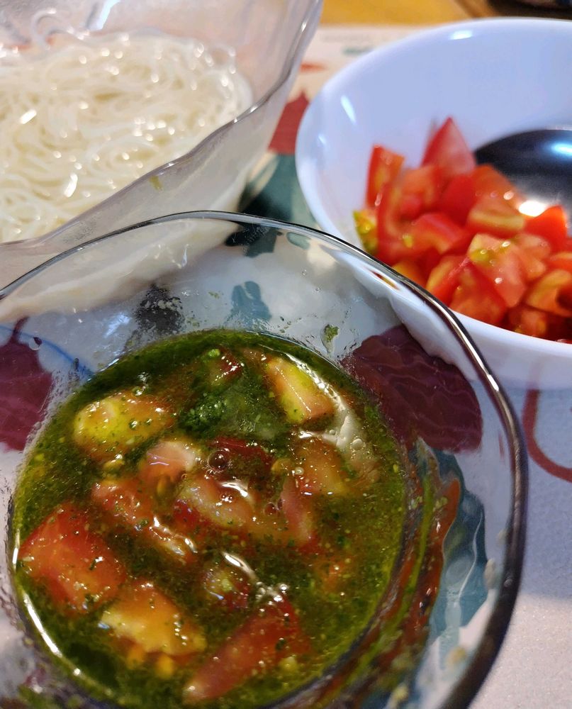 洋風素麺に変身して、トマトがお口直しというか、箸休め的なそんざいで、バジルソースのニンニクが後を引いて、