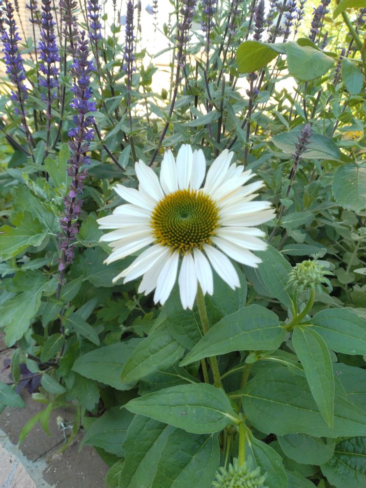 今朝発見したエキナセア。ここはもともとピンクのエキナセアを植えていたはず…。春先に元の株のとこからは目があまり出て無くて、その横のちょっと不自然なとこから芽が出てるなぁとは思っていたのですが…。この奥にグリーンジュエルというエキナセアを植えているので交配して出来た種がこぼれたのかな。