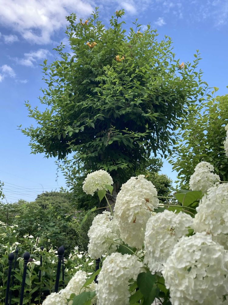4️⃣ アナベルの向こうの大木には黄色のノウゼンカズラが咲き出して
