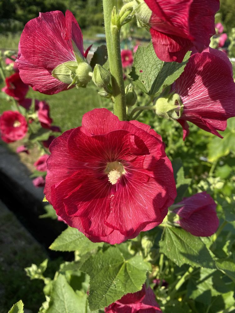 散歩道で暑そうなタチアオイでした😅