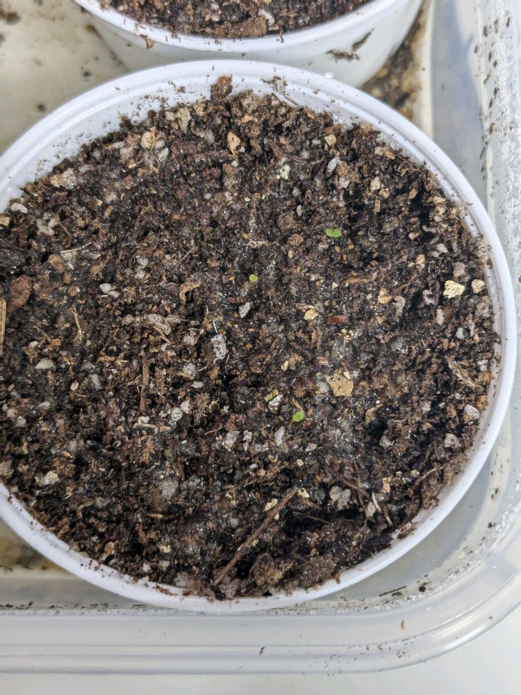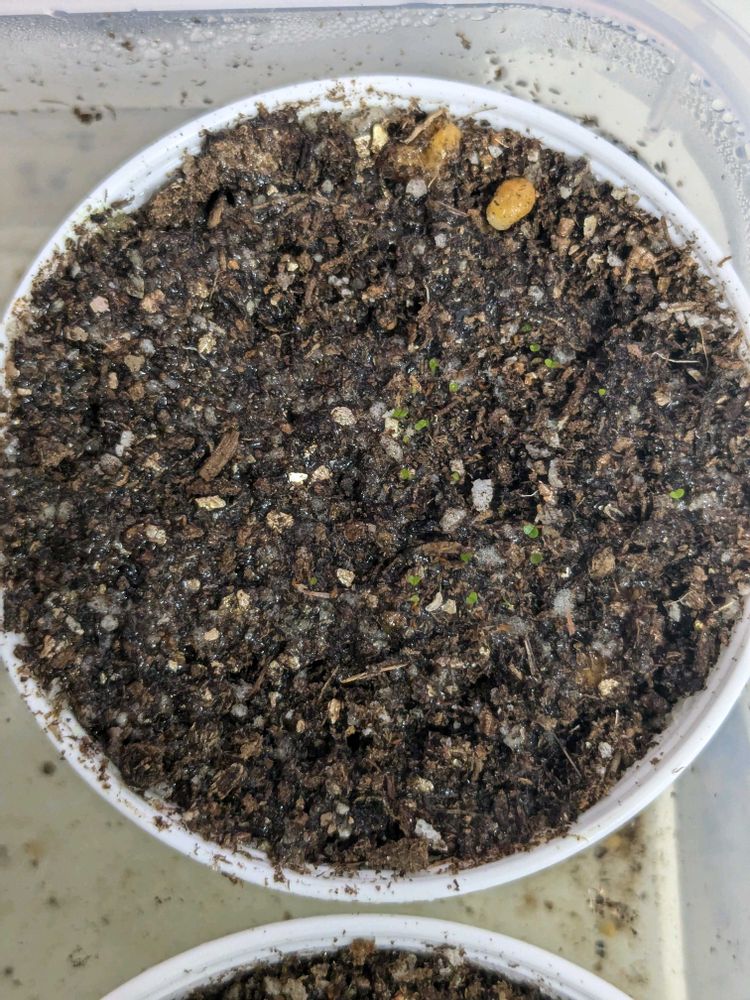 ④アフィニス(セルフ)さん。一斉に発芽🌱しかし小さい!今まで見た中で一番小さい双葉です。アフィニス交配組も全滅っぽい😭😭いいもん、アフィニス増やしてみんなに送りつけてやる😁