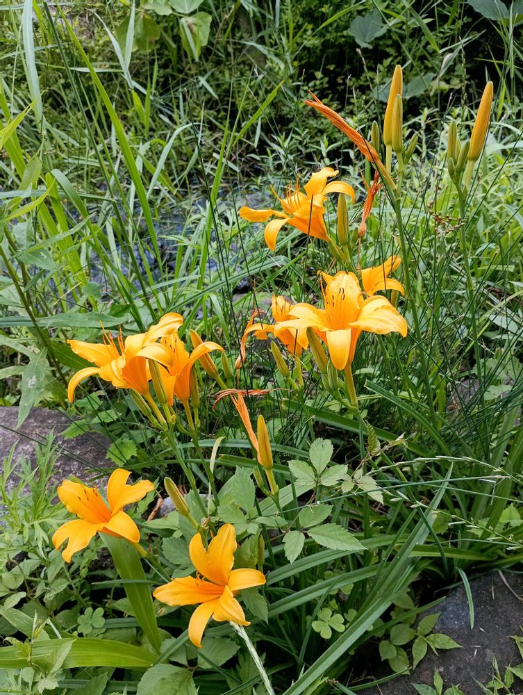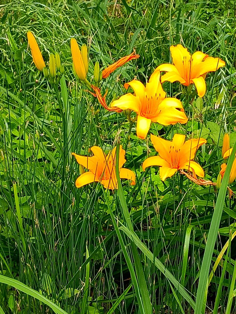 草むらの中に、オレンジ色の漏斗形の花😃✨