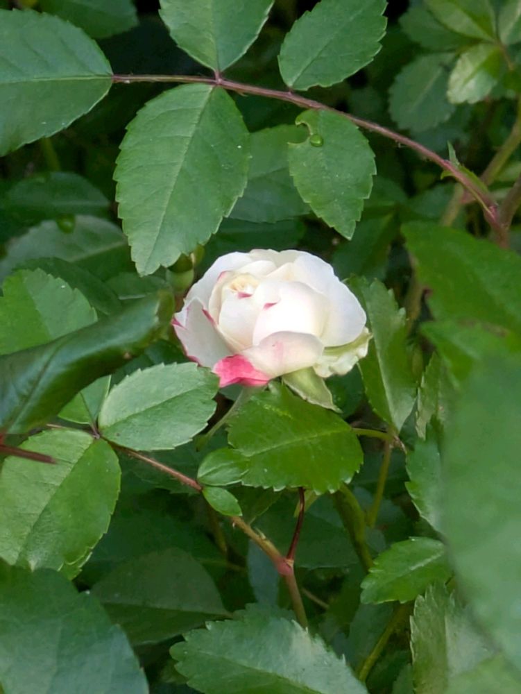 グリーンアイスは、蕾のうちはピンクがかっていて、花が開くと白、咲き進むと淡いグリーンになる色の変化が美しいミニバラ。半日陰で育てると、より緑色になりやすかったり、寒い時期にはところどころにピンクが出やすくなります。花径は3cmくらいで、樹高は50~60cmほど。横に張って枝垂れ気味に茂ります。四季咲きで花もちが良く、耐寒性、耐病性が強く育てやすい特長があります。一度咲き終わったら半分くらいの高さに切り戻しておくと再び開花します。冬の間は落葉しますが、乾かし気味に水やりを続けると春に芽吹きます。グリーンアイスは、挿し木で簡単に増やすことができます。適期は、5月下旬~6月下旬、10月下旬~11月上旬頃です。