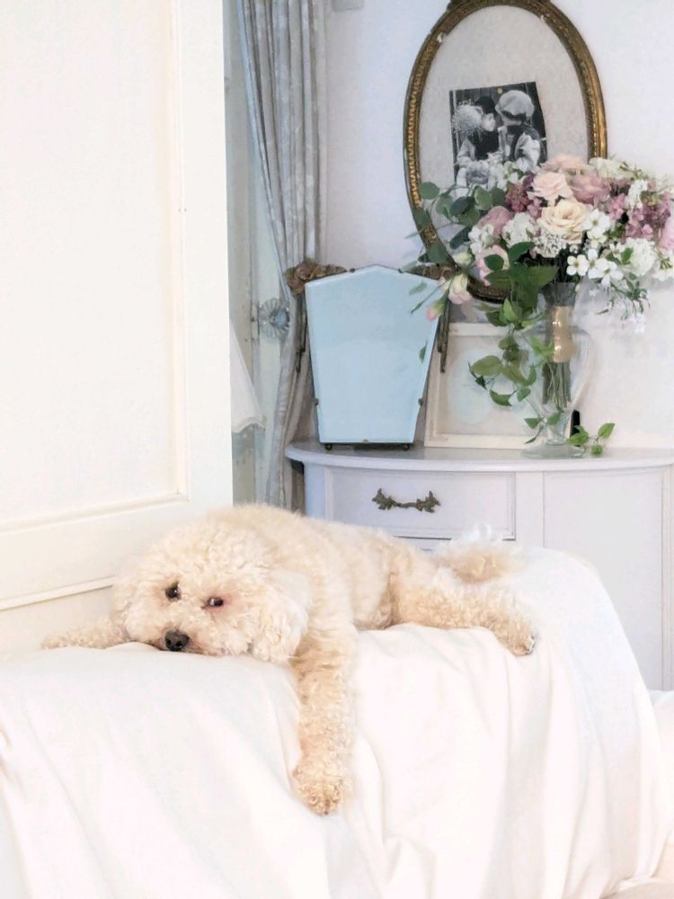 こう暑いと ワン🐶もダレダレソファーの背もたれに乗ってお昼寝してます