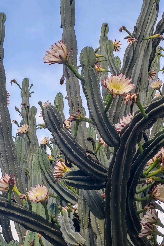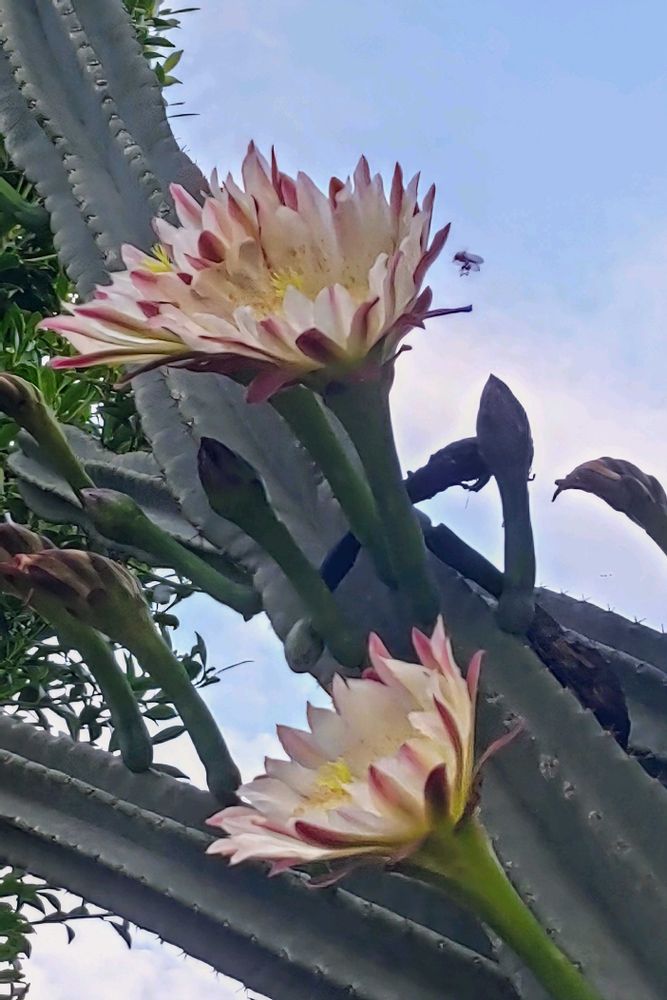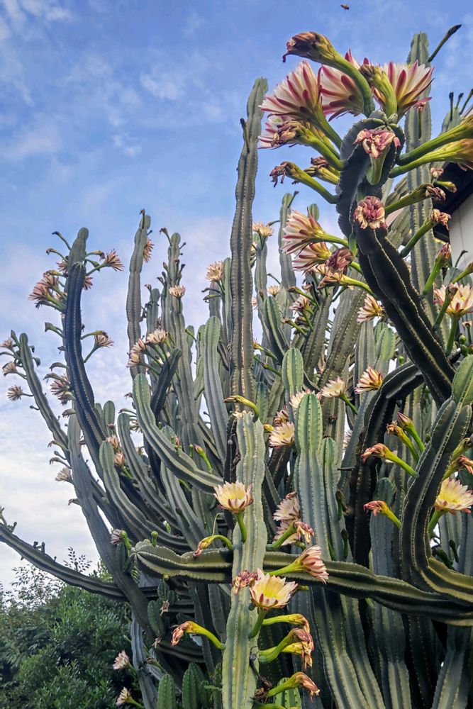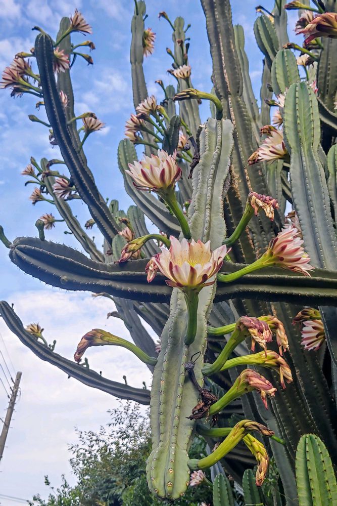 柱サボテン鋭稜柱がたくさんの花を付けた。