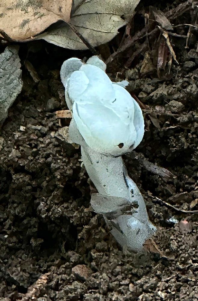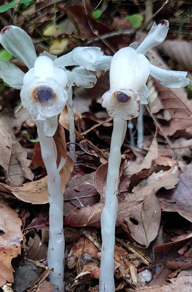 真っ白なギンリョウソウ(銀竜草)が咲き始めました、青い目が綺麗です🔵🤍🌿