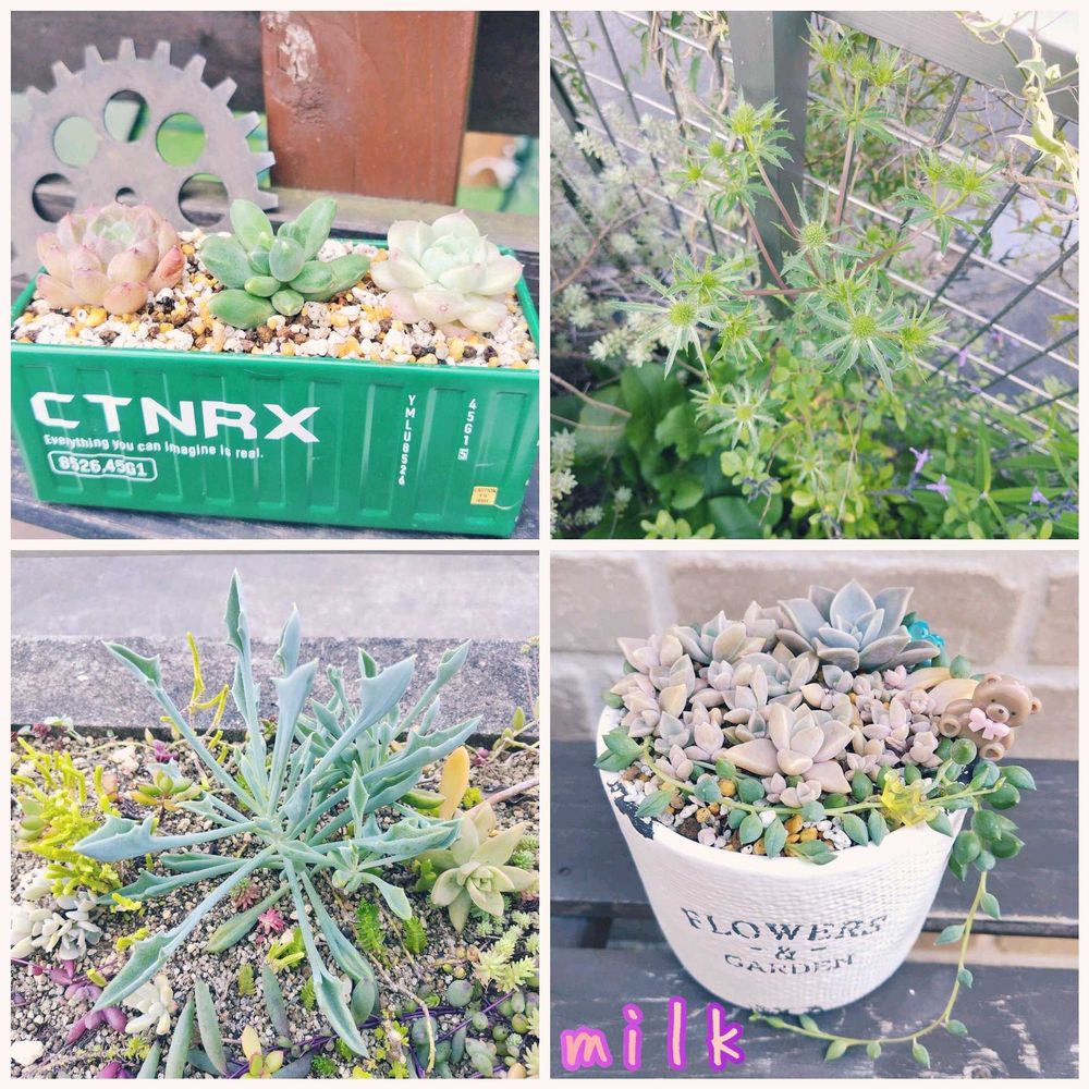 コンテナたち、旦那が何年か前に買ってきてくれて、ずっと放置してたんですよ😅穴開けがめんどくさくて( ^_^ ;)💦今年やっと穴開けして使ってみたら、チビちゃん3つ植えるのに 丁度いいな〜って🎶他のデザインも買ってこようかな(*´艸`)