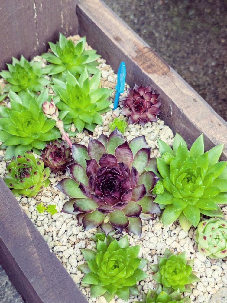 廃材利用の手作りプランターにセンペル詰め込みました。みどりんの子が強くてよく増えます。