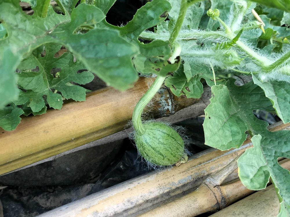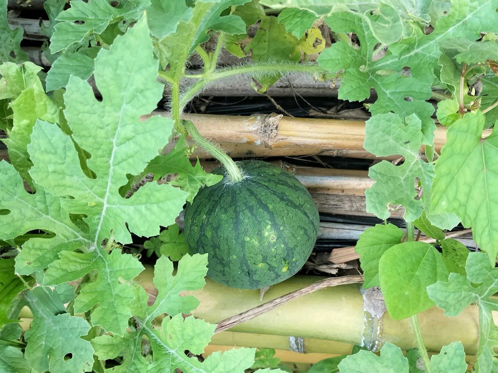写真に撮ってるたらなんだかすごくよくできてるみたいに見えるけどまだまだ小さいスイカ。