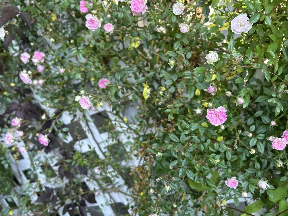 おはようございます☀修景薔薇のプリンセスピーチが咲き出して、クレマチス ピンクパッションとコラボしてくれました🌸 嬉しい💕