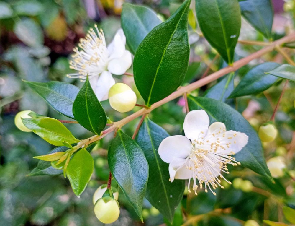 【地中海沿岸を主な原産地とする、常緑低木の「ギンバイカ(マートル)」。 別名「祝いの木」とも呼ばれ、ギリシャ女神の聖木として、聖書にも「喜び」「平和の象徴」として登場します。 春におしべが花火のように広がる、梅に似た美しい白い花を咲かせることから、和名を銀梅花(ギンバイカ)、あるいは銀香梅(ギンコウバイ)と言います】