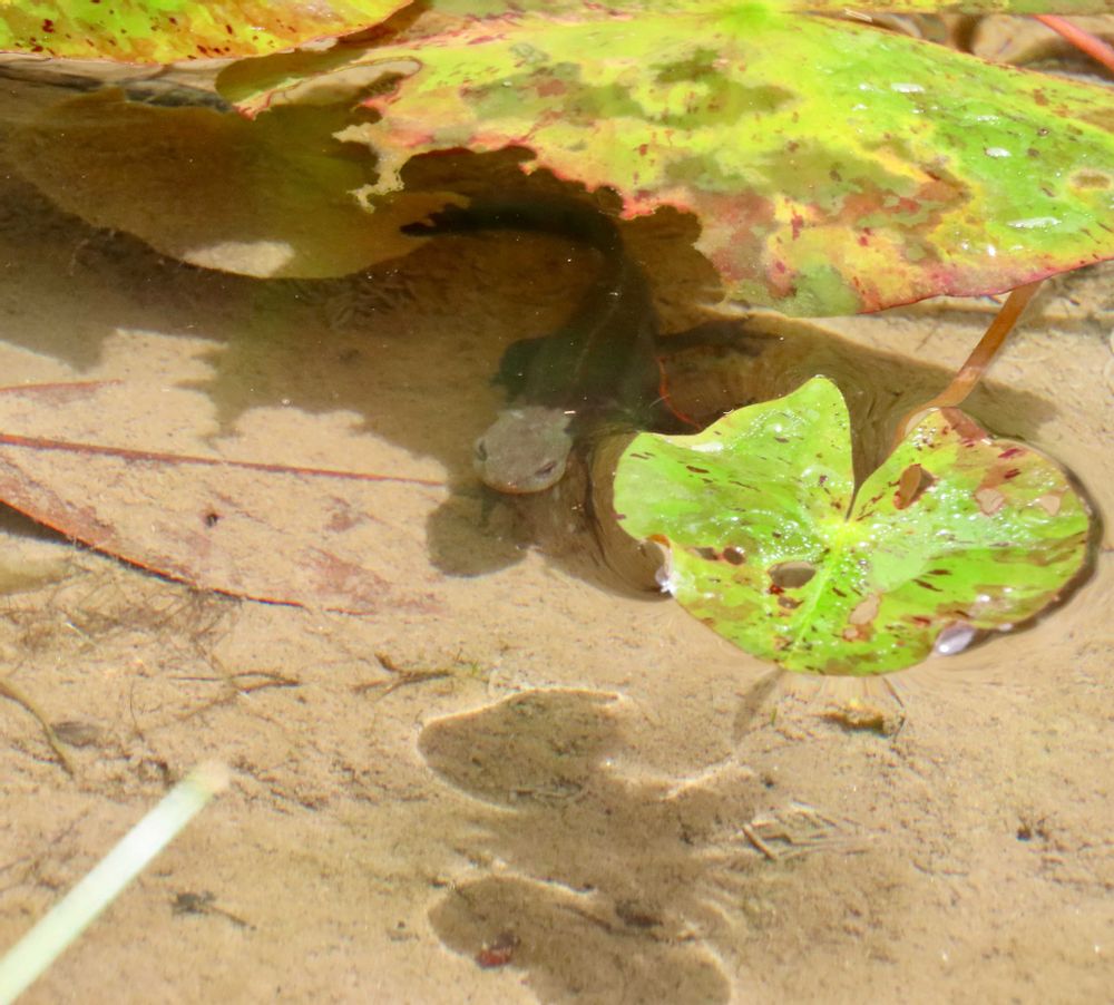 葉っぱの下から光に当たっている頭が可愛い😆💓アカハライモリ🦎ちゃん!!