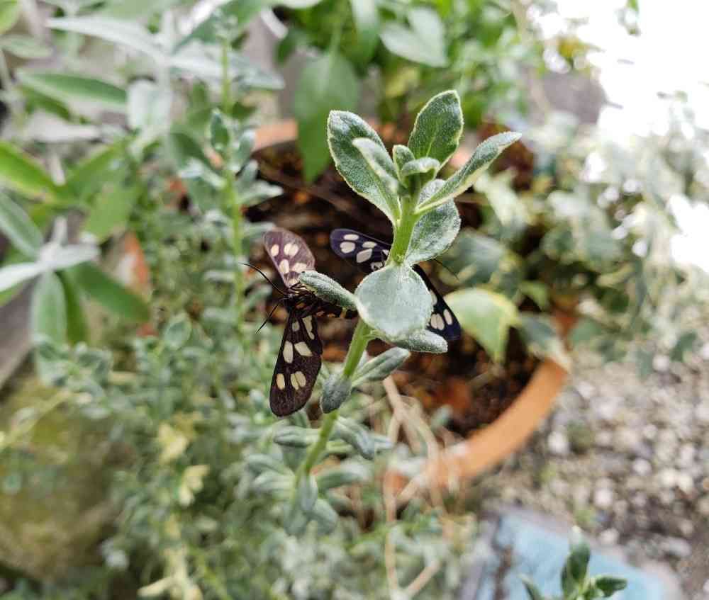 剪定作業に疲れてふと見ると、葉っぱの陰に…これは蝶かな?それとも蛾かな?( '-'* )?