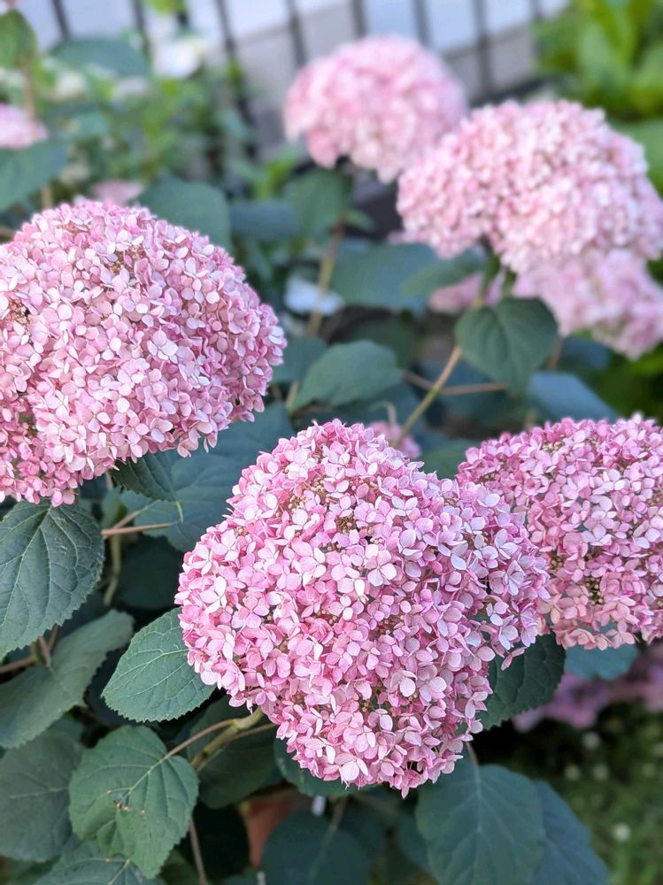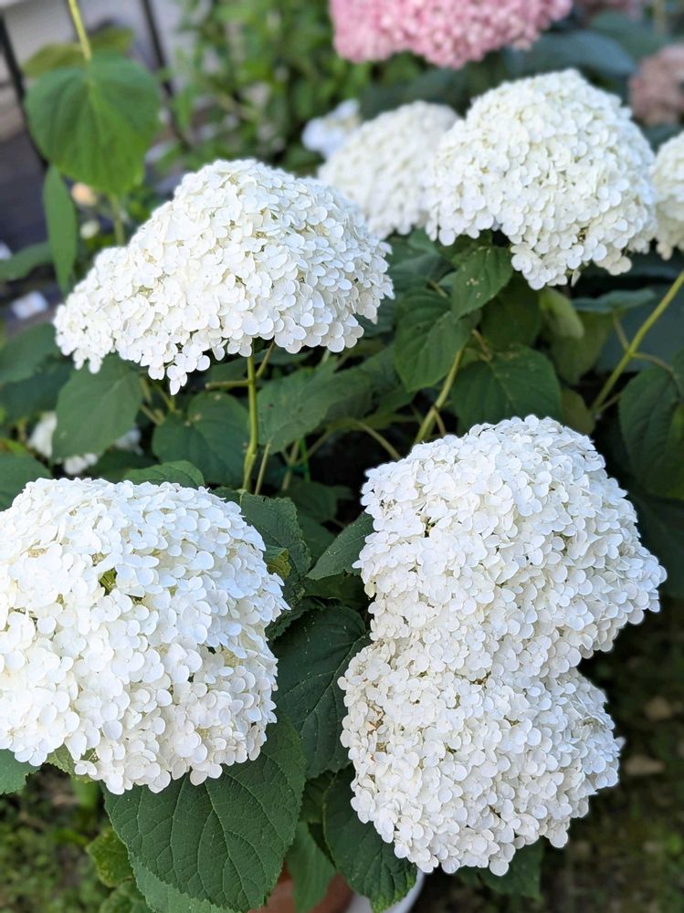 アナベルグランデクリームとアナベルミディピンクが、8号の駄温鉢で咲いています💝