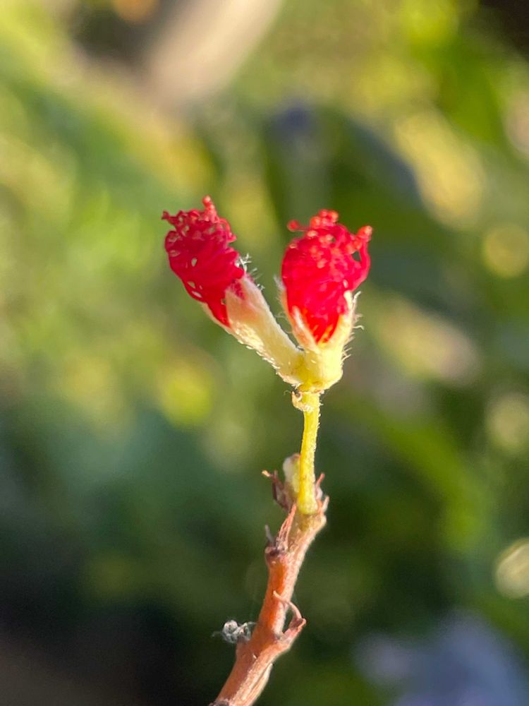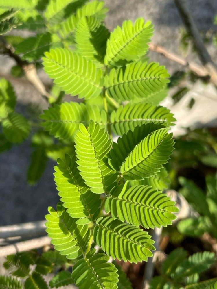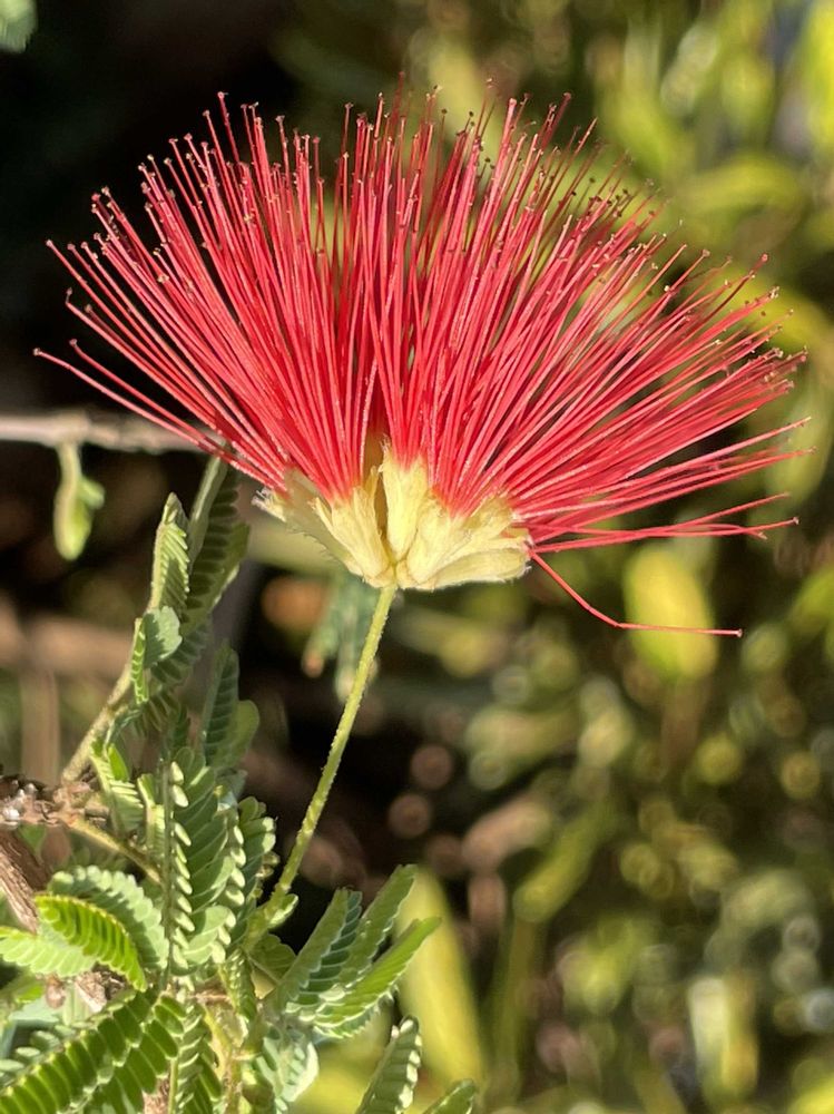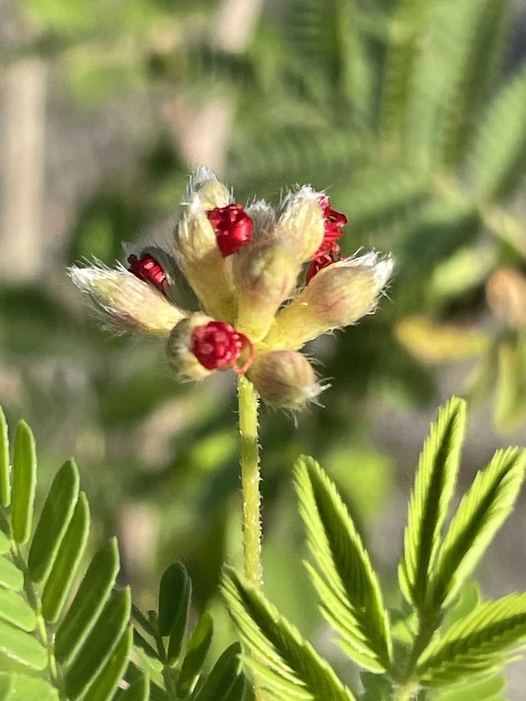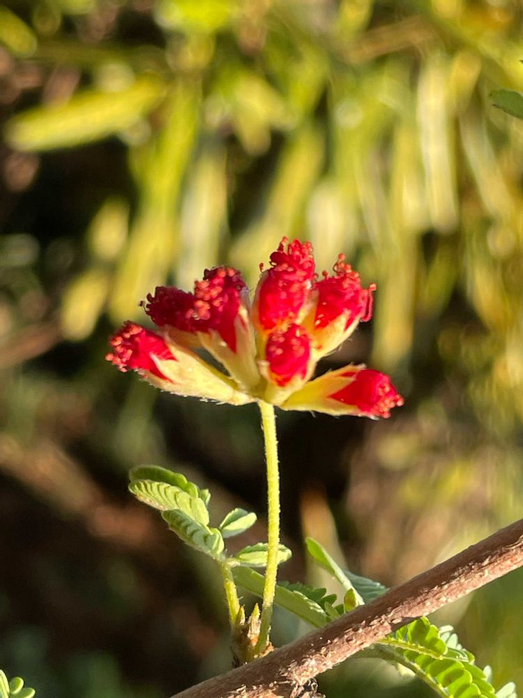 こちらは真っ赤なお花が咲きます。葉っぱも夜になると閉じてネムノキと似ています。