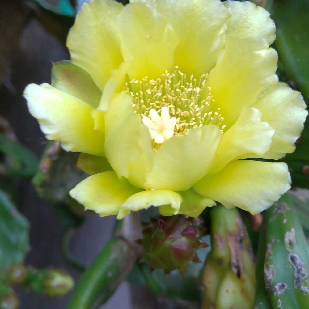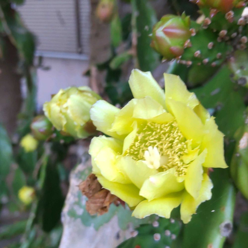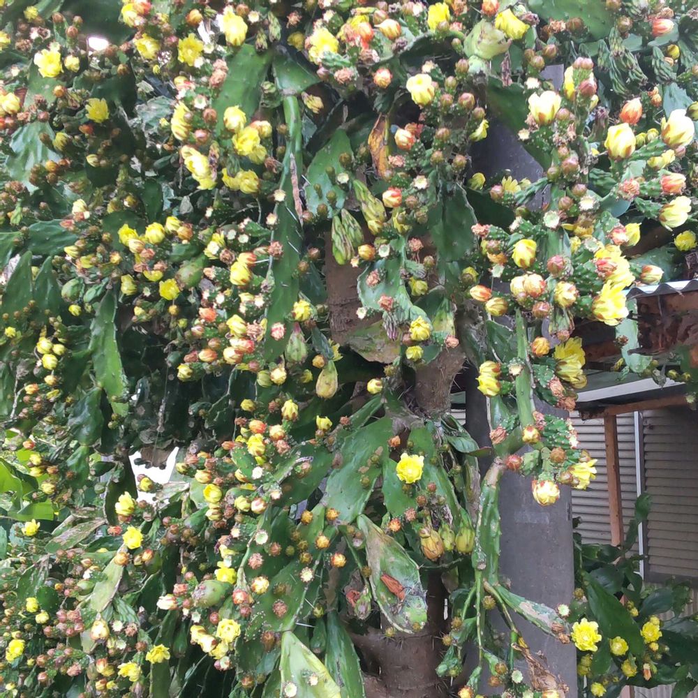 ここ2~3年 投稿していますが, 今年も信じられないくらい 沢山の蕾を付けた 巨大化したうちわサボテン🌵のお花