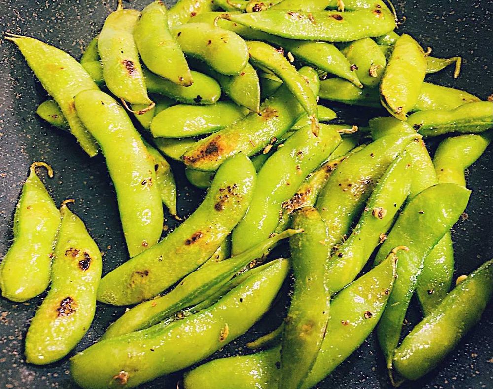 ①好みの硬さに塩茹でした枝豆をフライパンに広げ、中〜強火で時々返しながら両面程よく香ばしい焼き目をつける。