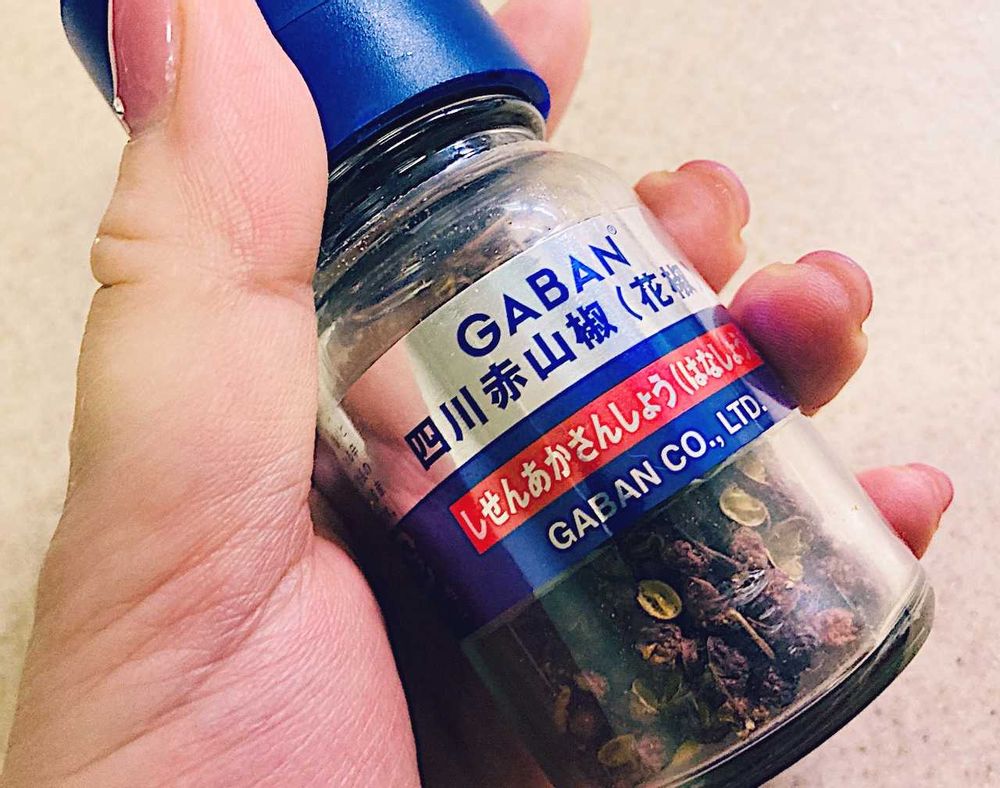 ②四川赤山椒(ホールの場合は、専用のミルでガリガリッ♪)を全体に3-4回ほど回しまぶし、山椒の風味が全体に絡まるようにフライパンを振るう。