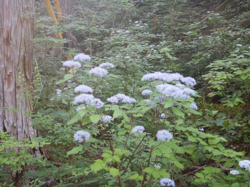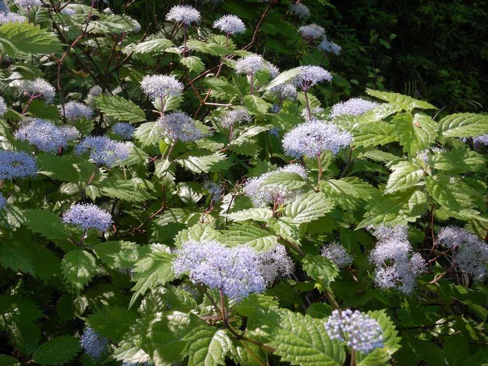 これはコアジサイ、薄い水色の花が涼やか、スギ・ヒノキ木立の中一面に咲いています。✾❀🌼🤗