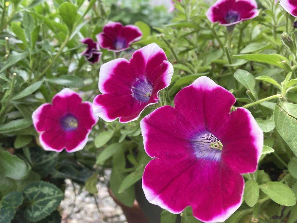 ③梅雨前の切り戻しからポツリポツリと花を見せ始めたサフィニアアート・あずきフラッペ♡