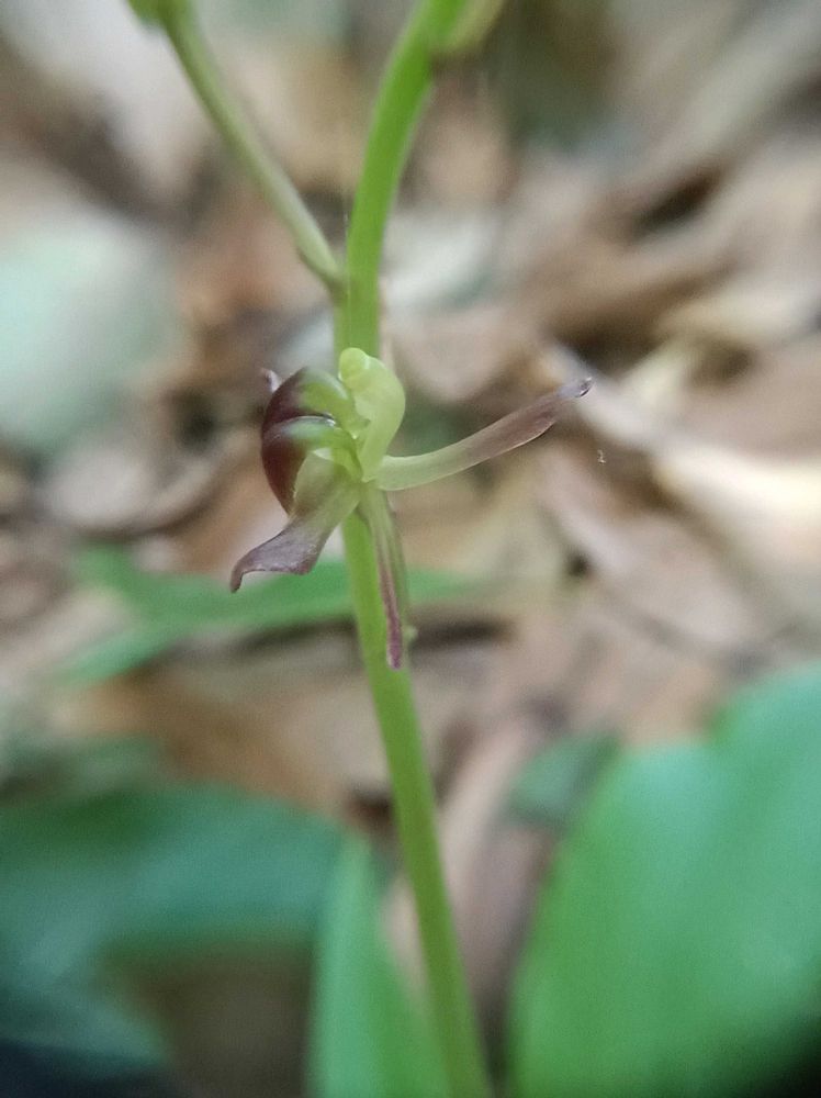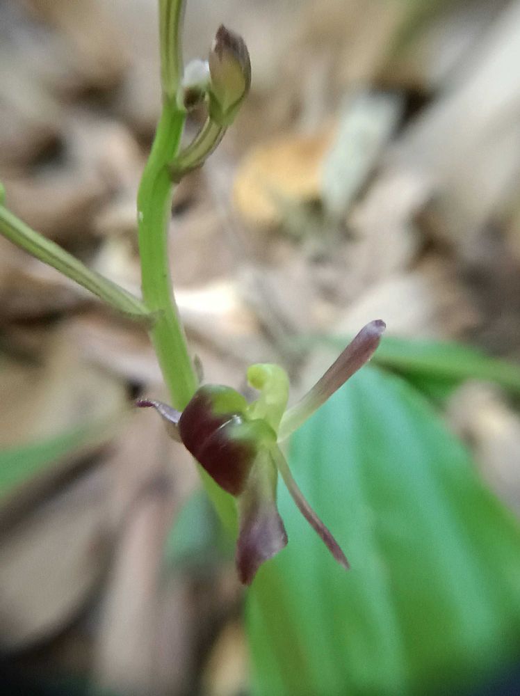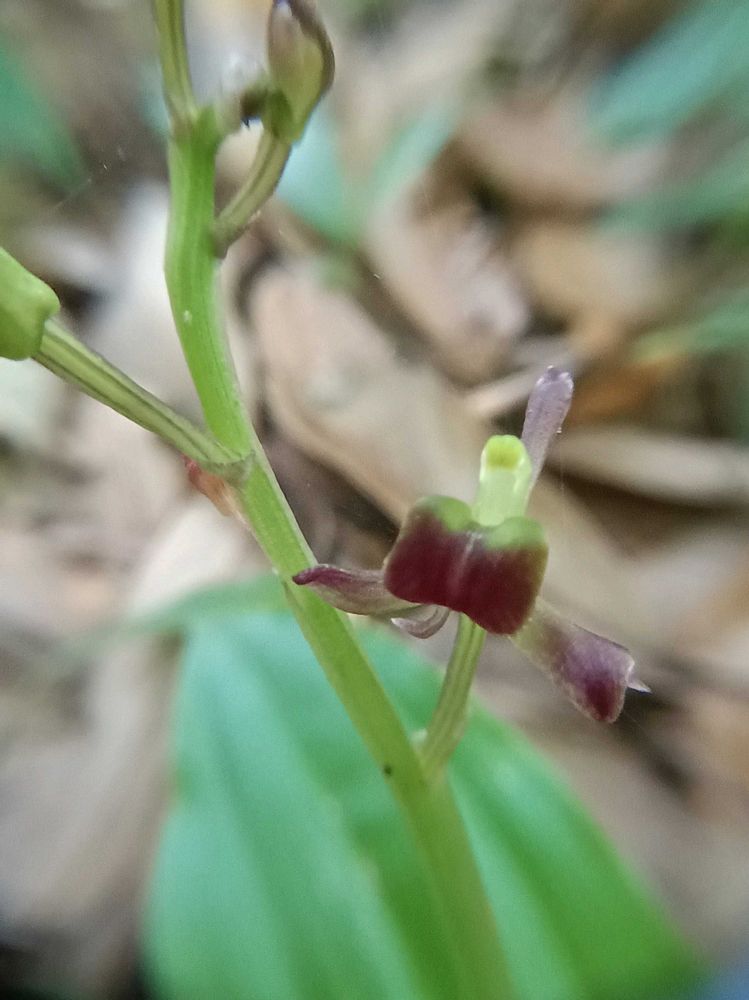コクランは通常、6月から7月に開花します。花は葉の間から花茎を伸ばし、高さ30cm程になり、3~10個の花が総状につきます。花の色は全体に紫褐色です。
