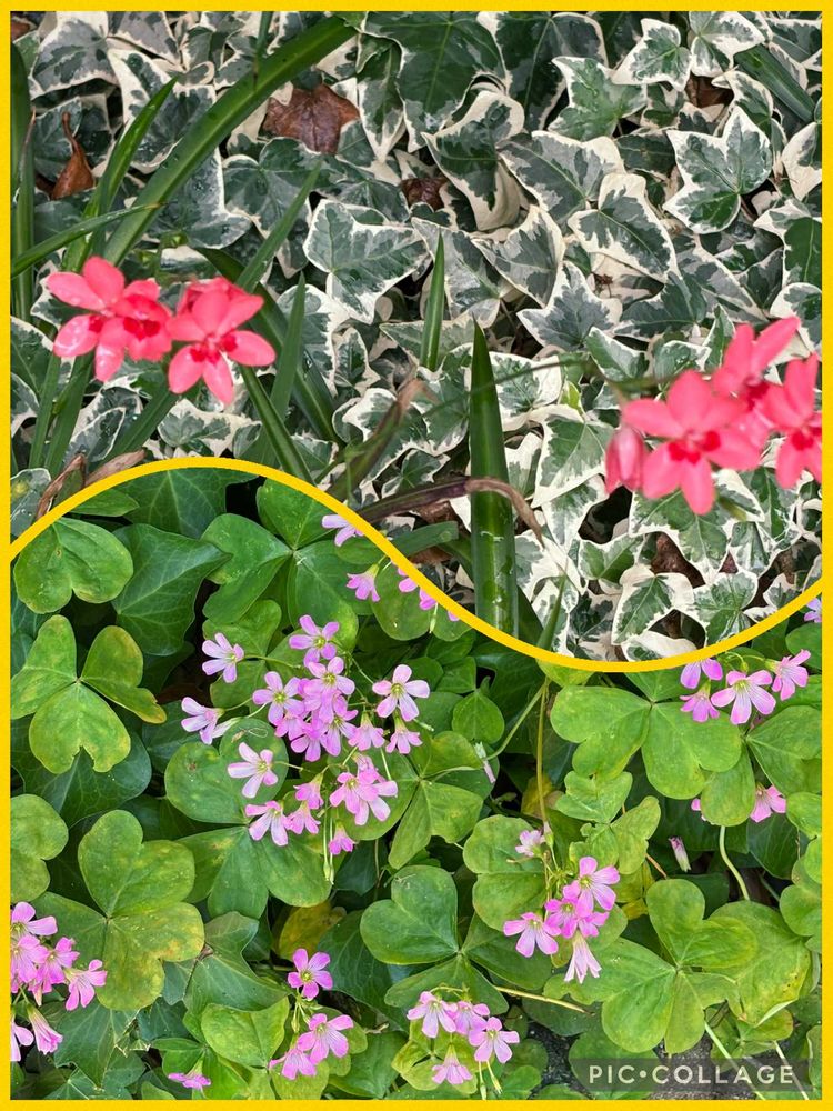 カリンの木やらがある植え込みの足元にはムラサキカタバミの花🌸が今年は沢山咲いていました(下)。