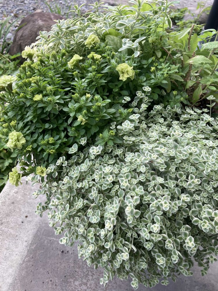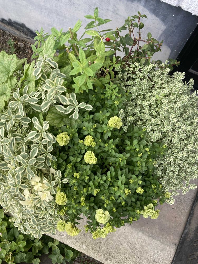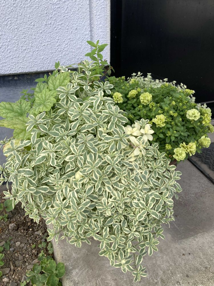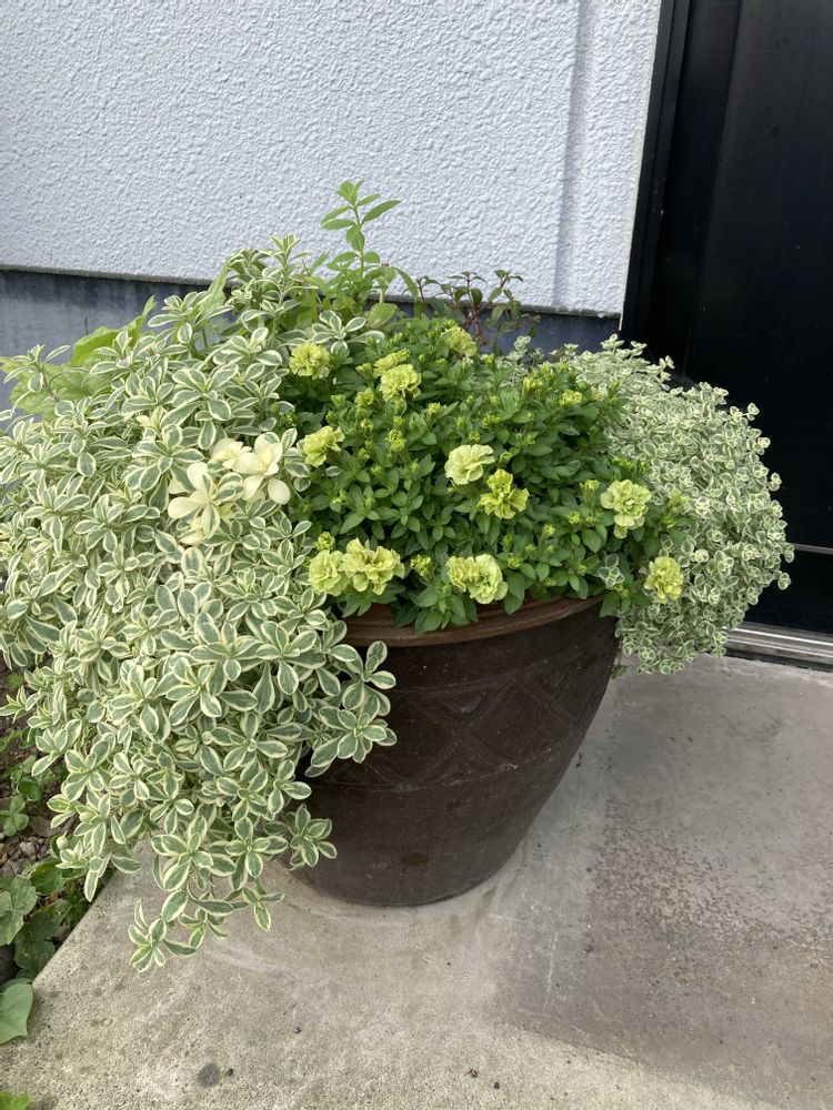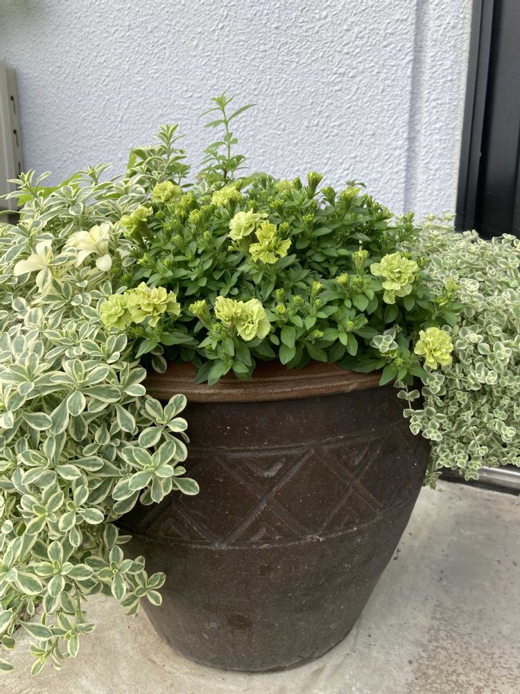 実はこの寄せ植え、すでにモリモリの間にペチュニアライム植えたのでこんな感じに…ペチュニアの前はイベリスの位置でした♪リサイクル寄せ植え♻️