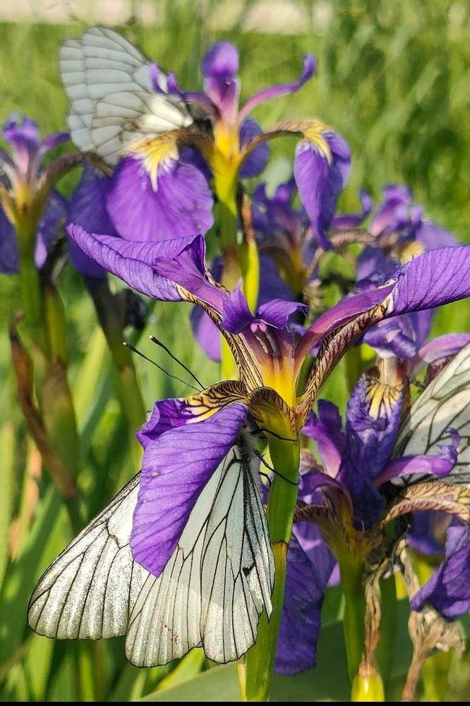ヒオウギアヤメに止まるエゾシロチョウ🦋