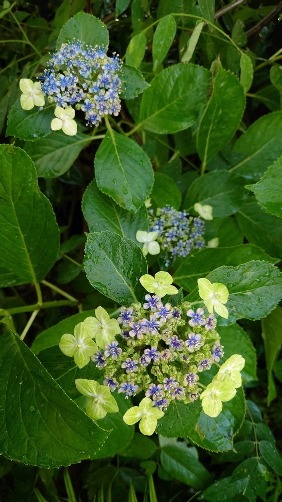 大島緑花〜💚💜💚一昨年挿し木して、今年咲いたから、ろろちゃんも来年は咲くよ〜この緑色の装飾花?が斑入りで素敵だよね〜💚🤍✨
